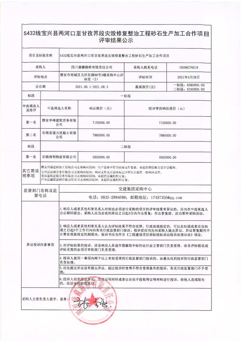 四川康藏路橋有限責(zé)任公司S432線寶興縣兩河口至甘孜界段災(zāi)毀修復(fù)整治工程砂石生產(chǎn)加工合作項(xiàng)目評(píng)審結(jié)果公示