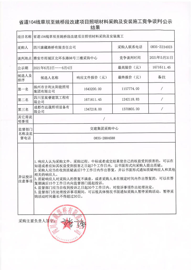 四川康藏路橋有限責任公司省道104線草壩至姚橋段改建項目照明材料采購及安裝施工競爭談判公示結果