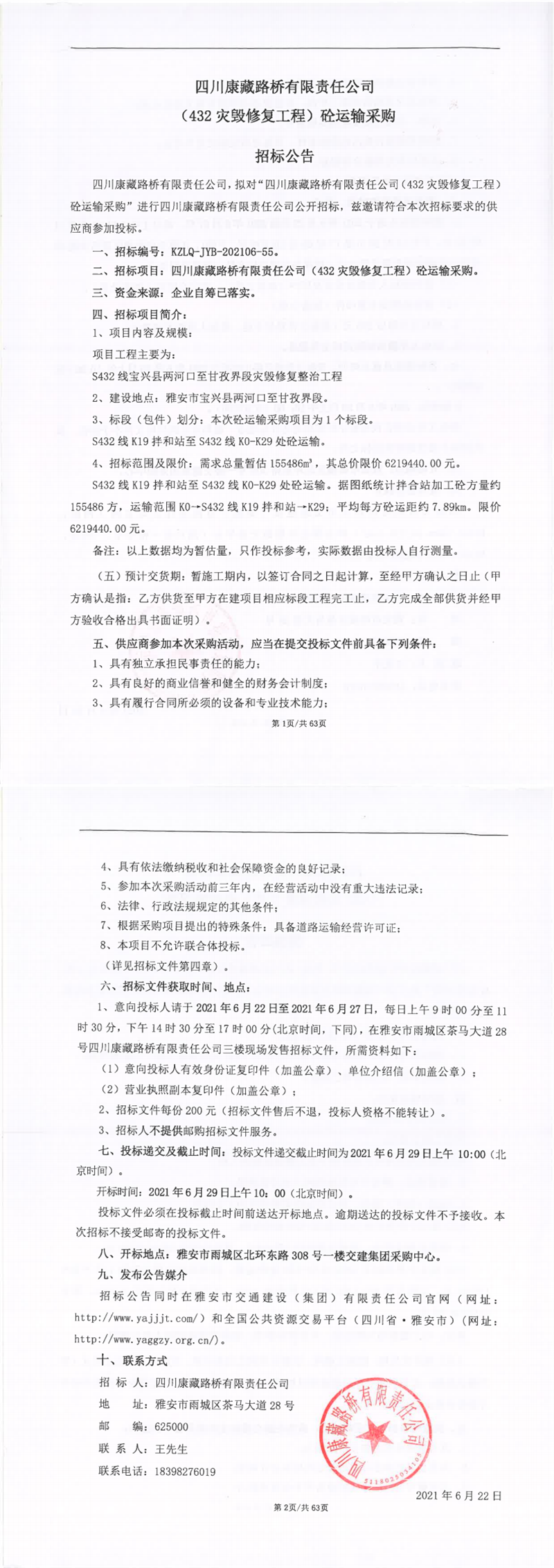 四川康藏路橋有限責任公司(432災毀修復工程)砼運輸采購招標公告