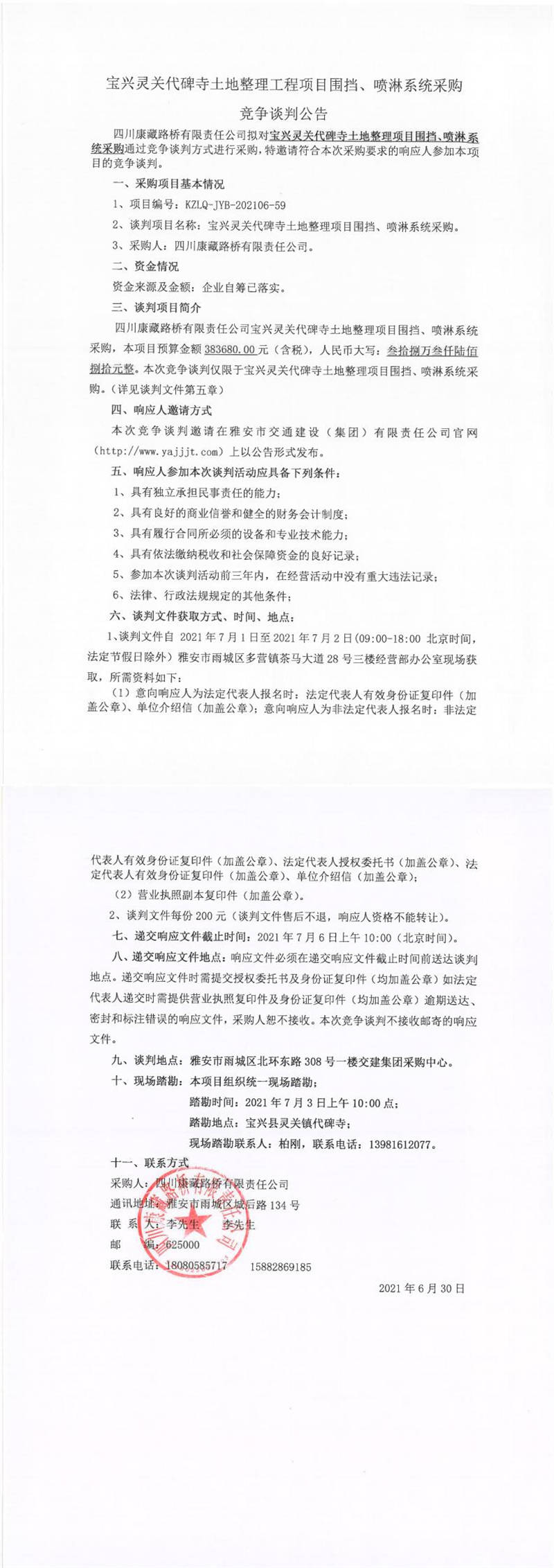 四川康藏路橋有限責(zé)任公司寶興靈關(guān)代碑寺土地整理工程項(xiàng)目圍擋、噴淋系統(tǒng)采購(gòu)競(jìng)爭(zhēng)談判公告