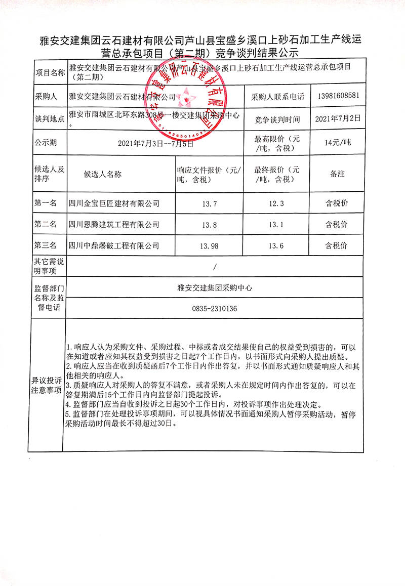 雅安交建集團(tuán)云石建材有限公司蘆山縣寶盛鄉(xiāng)溪口上砂石加工生產(chǎn)線運(yùn)營總承包項(xiàng)目(第二期)競爭談判結(jié)果公示