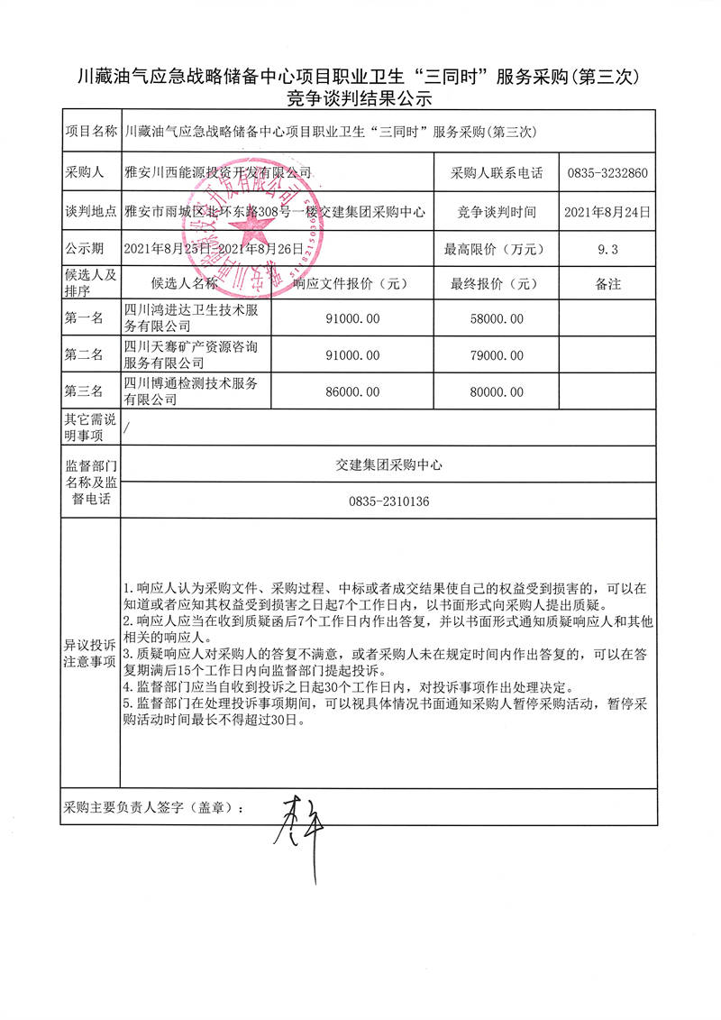 雅安川西能源投資開發(fā)有限公司川藏油氣應(yīng)急戰(zhàn)略儲(chǔ)備中心項(xiàng)目職業(yè)衛(wèi)生“三同時(shí)”服務(wù)采購(第三次)競(jìng)爭(zhēng)談判結(jié)果公示