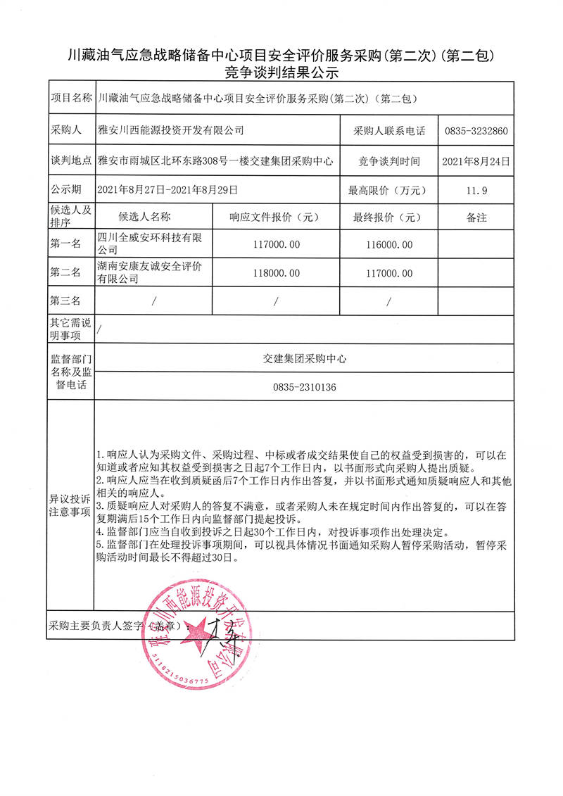 川藏油氣應(yīng)急戰(zhàn)略?xún)?chǔ)備中心項(xiàng)目安全評(píng)價(jià)服務(wù)采購(gòu)(第二次)(第一包、第二包)競(jìng)爭(zhēng)談判結(jié)果公示
