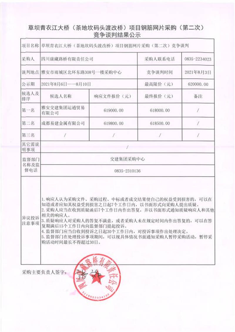 四川康藏路橋有限責任公司草壩青衣江(茶地坎碼頭渡改橋)項目鋼筋片采購競爭談判結(jié)果公示