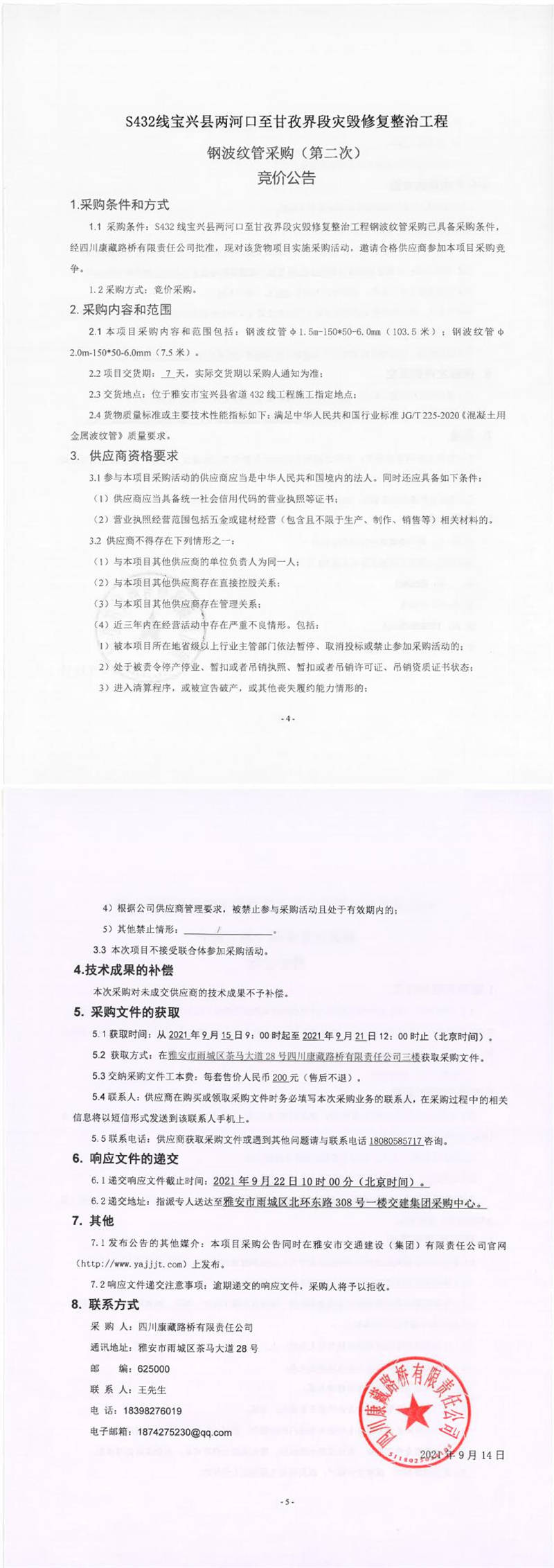 四川康藏路橋有限責(zé)任公司S432線寶興縣兩河口至甘孜界段災(zāi)毀修復(fù)整治工程鋼波紋管采購(gòu)(第二次)競(jìng)價(jià)公告