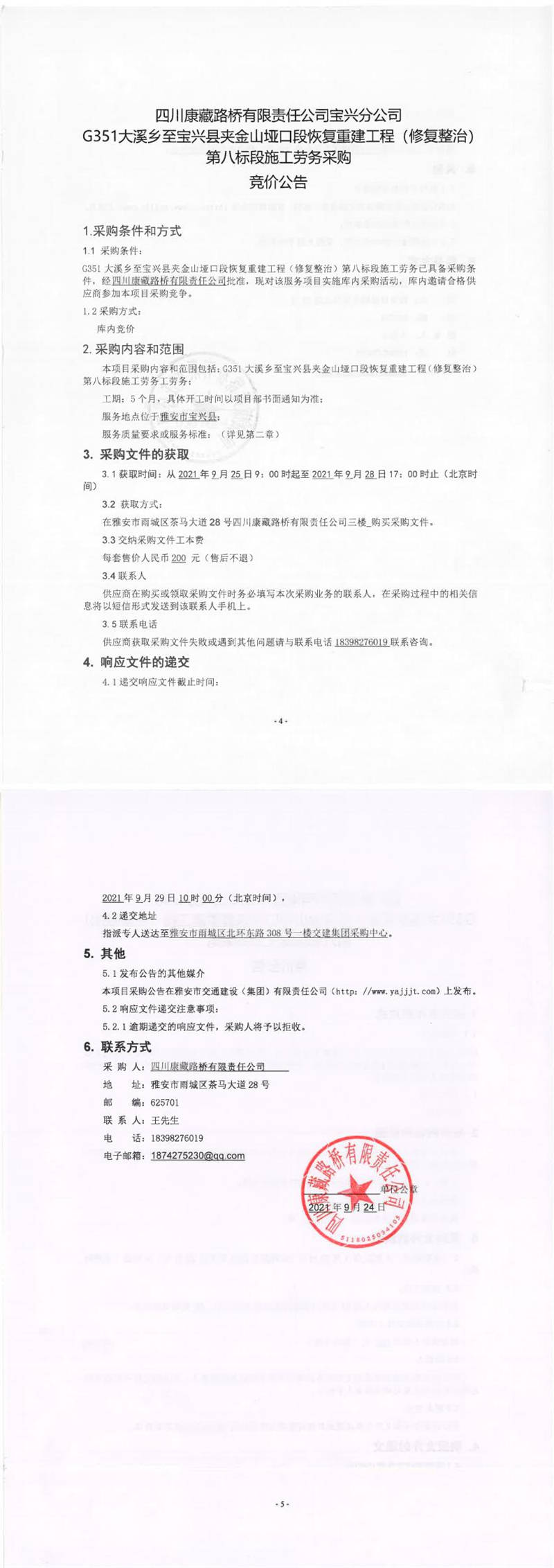 四川康藏路橋有限責(zé)任公司寶興分公司G351大溪鄉(xiāng)至寶興縣夾金山埡口段恢復(fù)重建工程(修復(fù)整治)第八標(biāo)段施工勞務(wù)采購競價(jià)公告