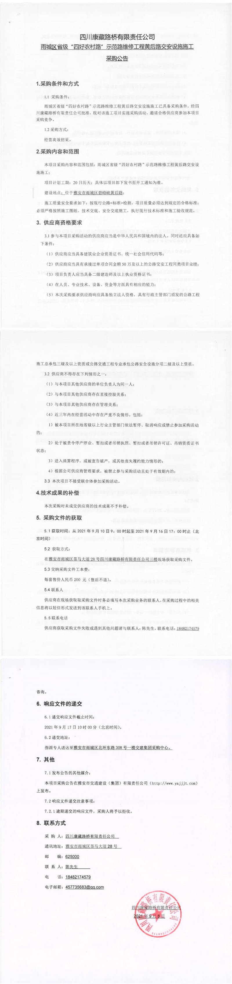 四川康藏路橋有限責任公司雨城區(qū)省級“四好農村路”示范路維修工程黃后路交安設施施工采購公告