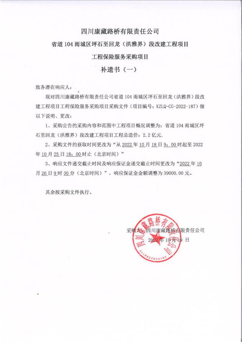 四川康藏路橋有限責(zé)任公司省道104雨城區(qū)坪石至回龍(洪雅界)段改建工程項(xiàng)目工程保險(xiǎn)服務(wù)采購(gòu)項(xiàng)目補(bǔ)遺書(shū)(一)