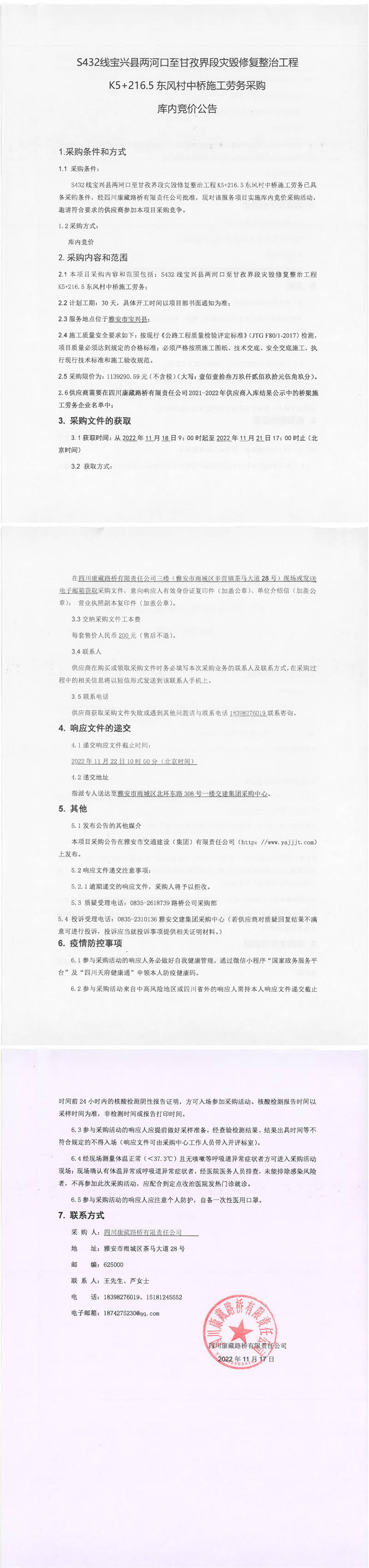 四川康藏路橋有限責任公司S432線寶興縣兩河口至甘孜界段災毀修復整治工程K5+216.5東風村中橋施工勞務采購庫內競價公告