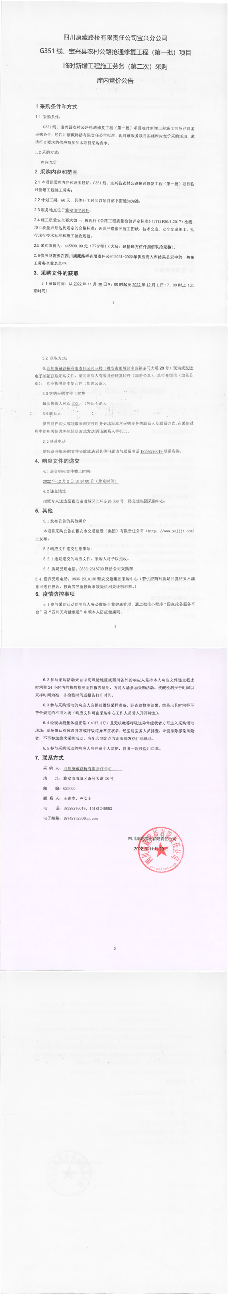 四川康藏路橋有限責任公司G351線、寶興縣農(nóng)村公路搶通修復(fù)工程(第一批)項目臨時新增工程施工勞務(wù)(第二次)采購庫內(nèi)競價公告