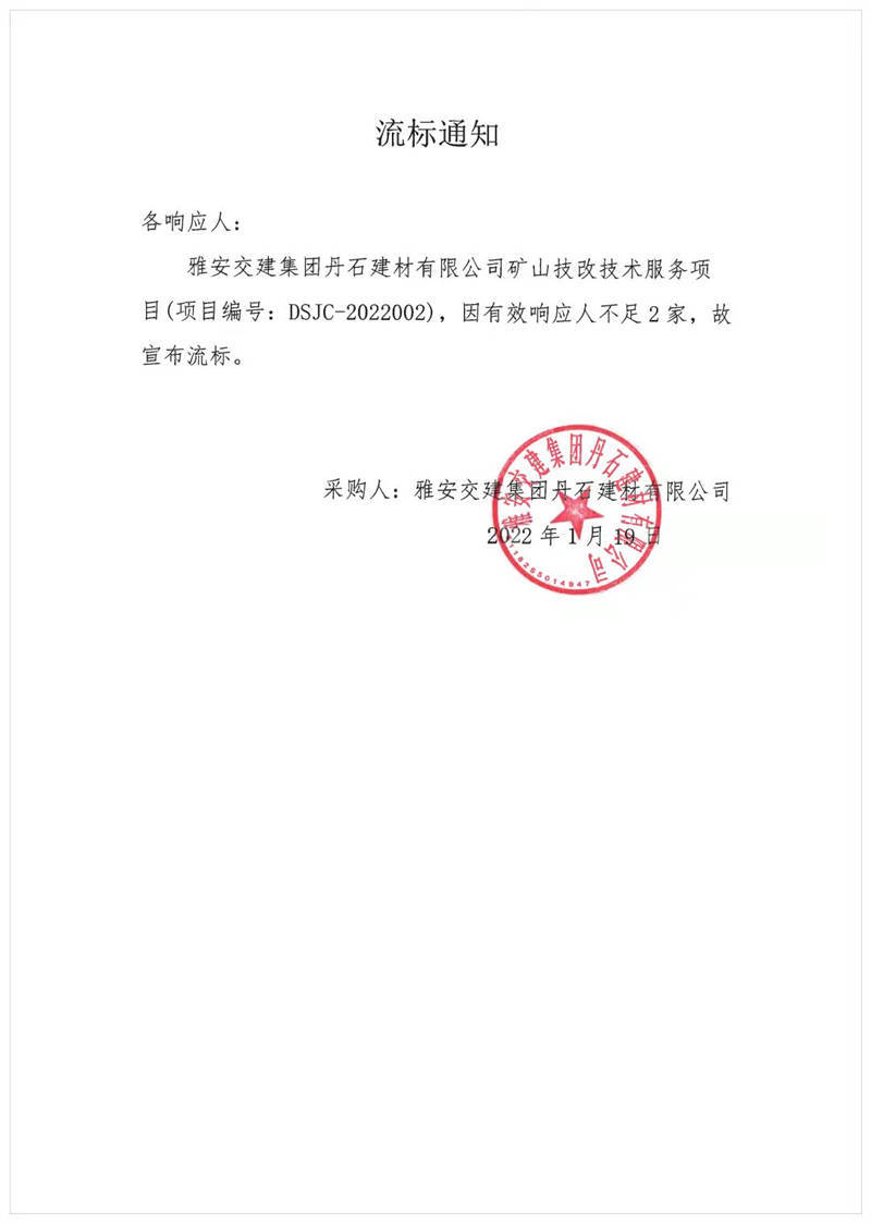 雅安交建集團(tuán)丹石建材有限公司礦山技改技術(shù)服務(wù)項(xiàng)目流標(biāo)通知
