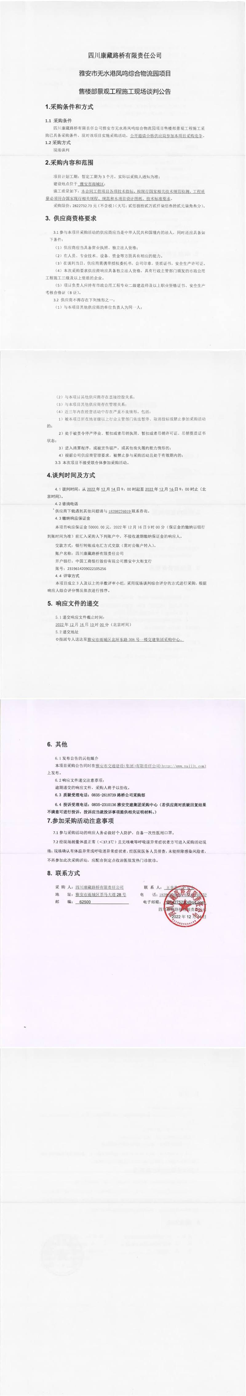 四川康藏路橋有限責(zé)任公司雅安市無水港鳳鳴綜合物流園項目售樓部景觀工程施工現(xiàn)場談判公告