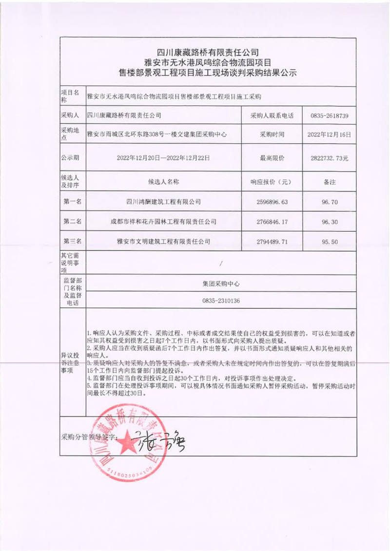 四川康藏路橋有限責任公司雅安市無水港鳳鳴綜合物流園項目售樓部景觀工程施工現(xiàn)場談判采購結果公示