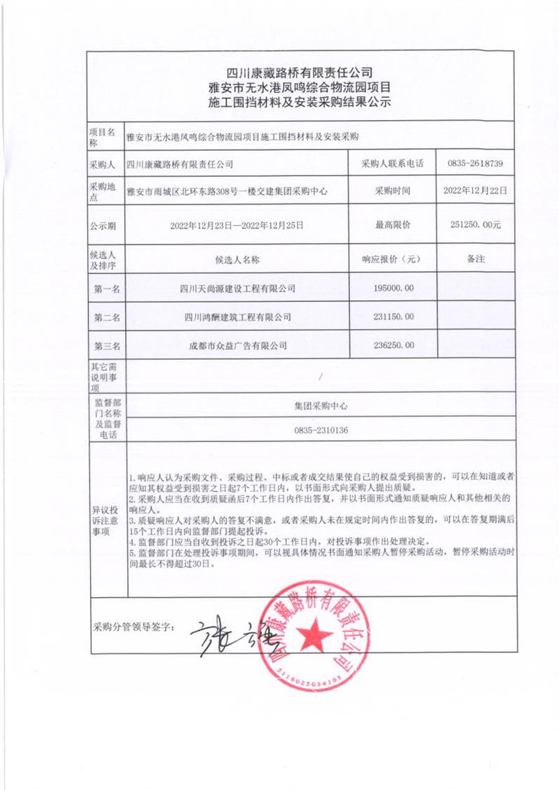 四川康藏路橋有限責(zé)任公司雅安市無水港鳳鳴綜合物流園項(xiàng)目施工圍擋材料及安裝采購結(jié)果公示