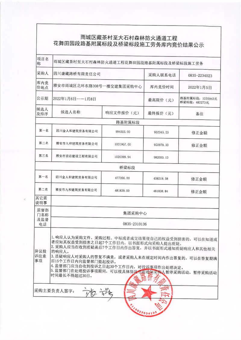 四川康藏路橋有限責任公司雨城雨城區(qū)藏茶村至大石村森林防火通道工程花舞田園段路基附屬標段及橋梁標段施工勞務庫內(nèi)競價結(jié)果公示