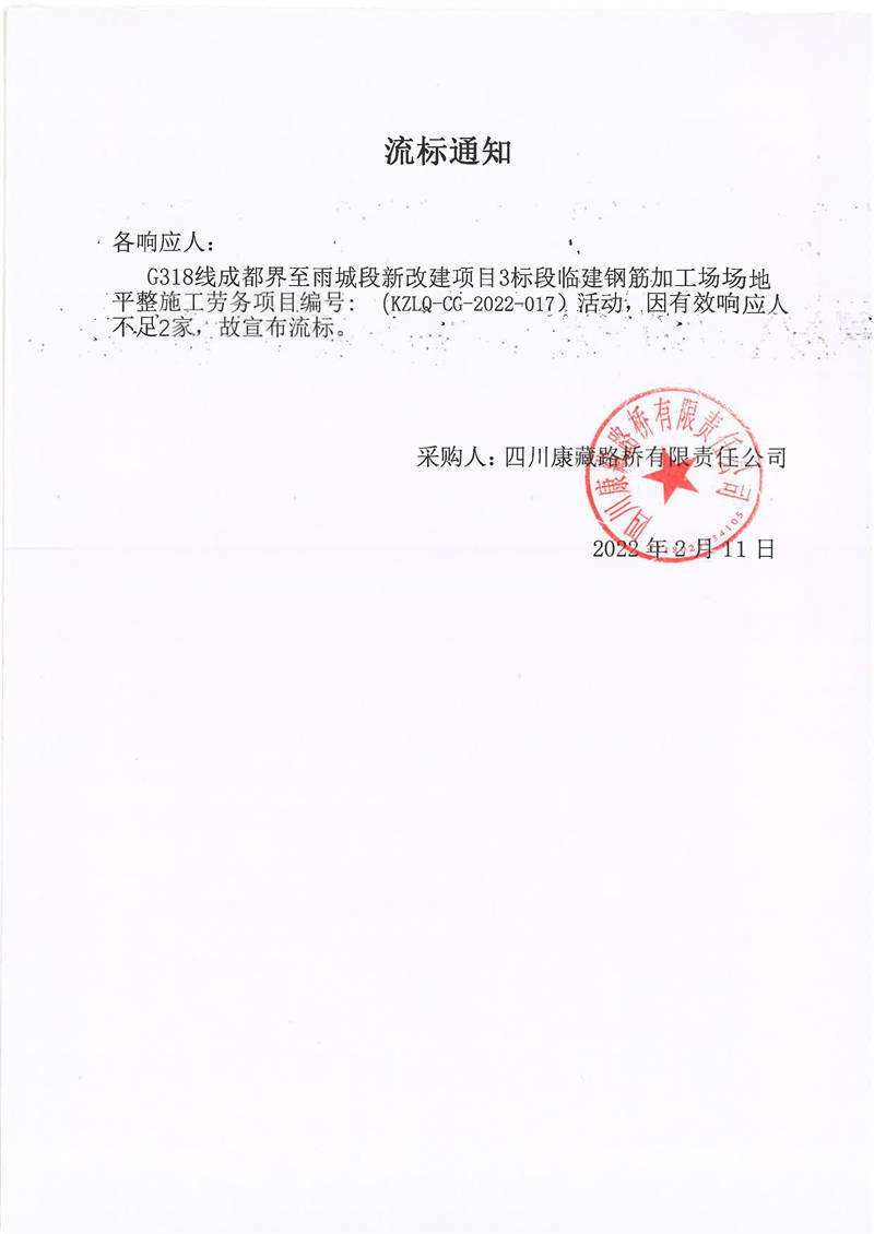 四川康藏路橋有限責(zé)任公司G318線成都界至雨城段新改建項目3標(biāo)段臨建鋼筋加工場場地平整施工勞務(wù)項目流標(biāo)通知