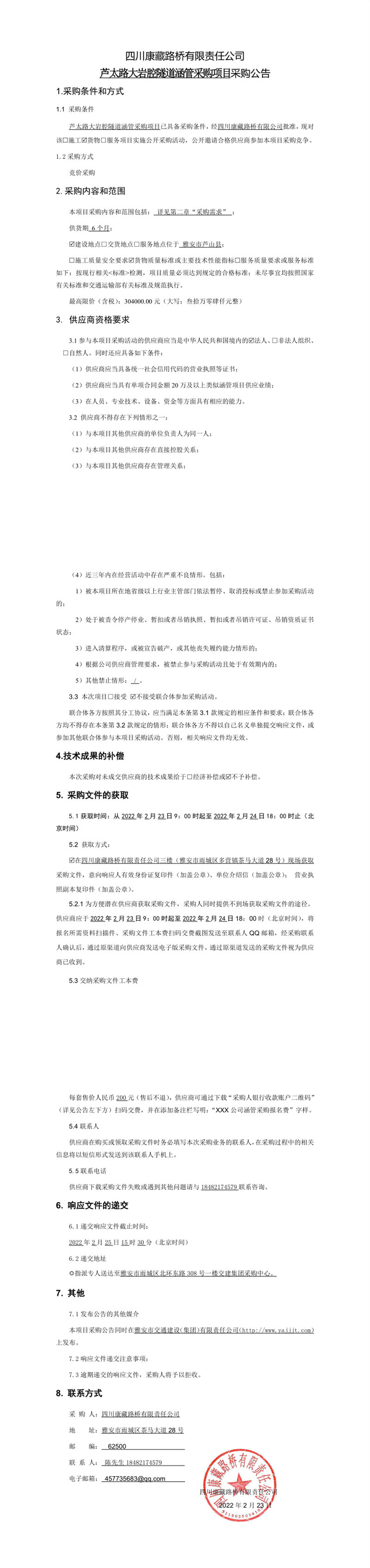 四川康藏路橋有限責任公司蘆太路大巖腔隧道涵管采購項目采購公告