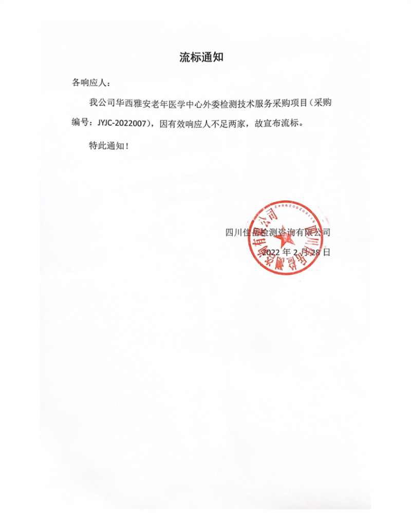 四川佳岳檢測咨詢有限公司華西雅安老年醫(yī)學(xué)中心外委檢測技術(shù)服務(wù)采購項目流標通知