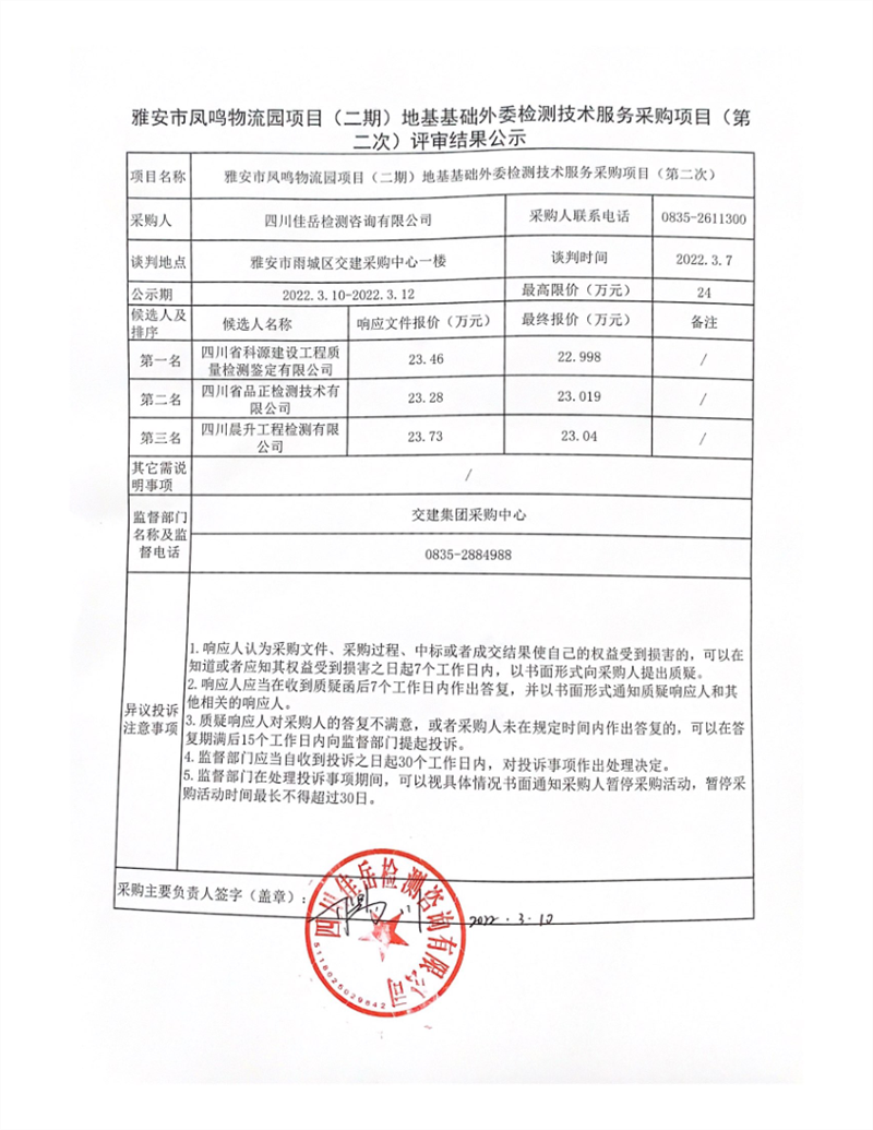 四川佳岳檢測(cè)咨詢有限公司雅安市鳳鳴物流園項(xiàng)目(二期)地基基礎(chǔ)外委檢測(cè)技術(shù)服務(wù)采購項(xiàng)目(第二次)評(píng)審結(jié)果公示