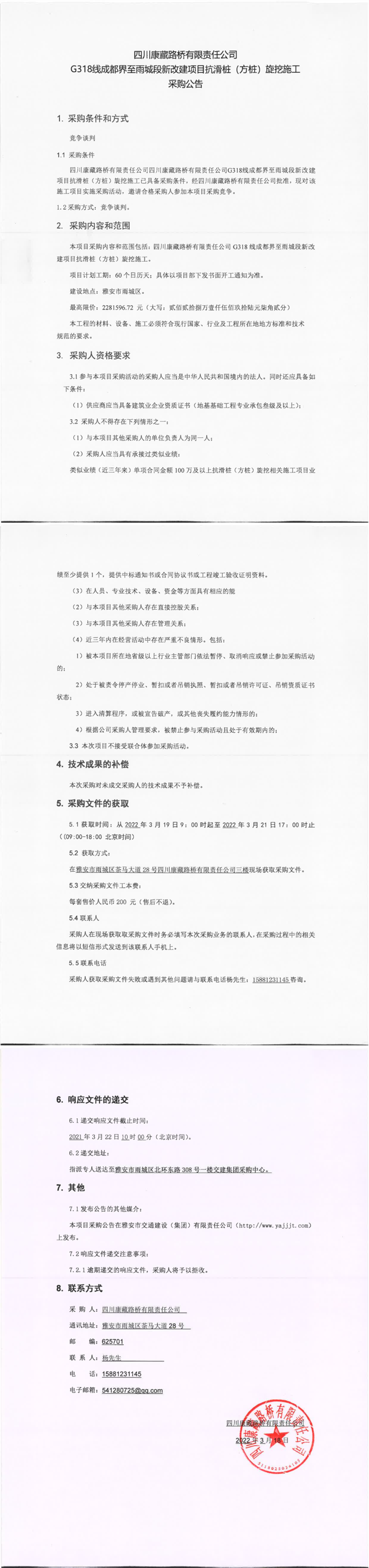 四川康藏路橋有限責任公司G318線成都界至雨城段新改建項目抗滑樁(方樁)旋挖施工采購公告