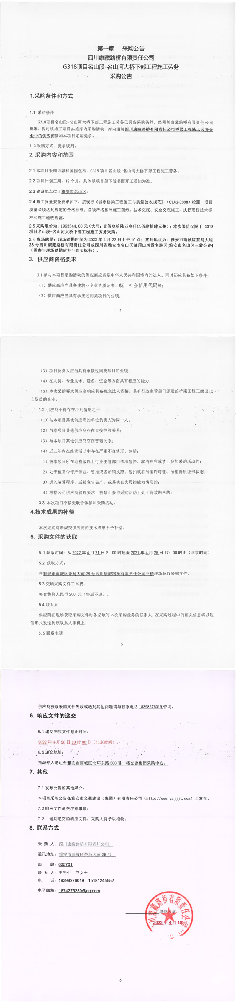 四川康藏路橋有限責(zé)任公司G318項(xiàng)目名山段-名山河大橋下部工程施工勞務(wù)采購(gòu)公告