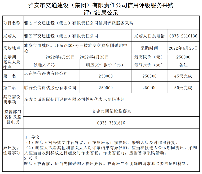 雅安市交通建設(shè)(集團(tuán))有限責(zé)任公司信用評(píng)級(jí)服務(wù)采購評(píng)審結(jié)果公示