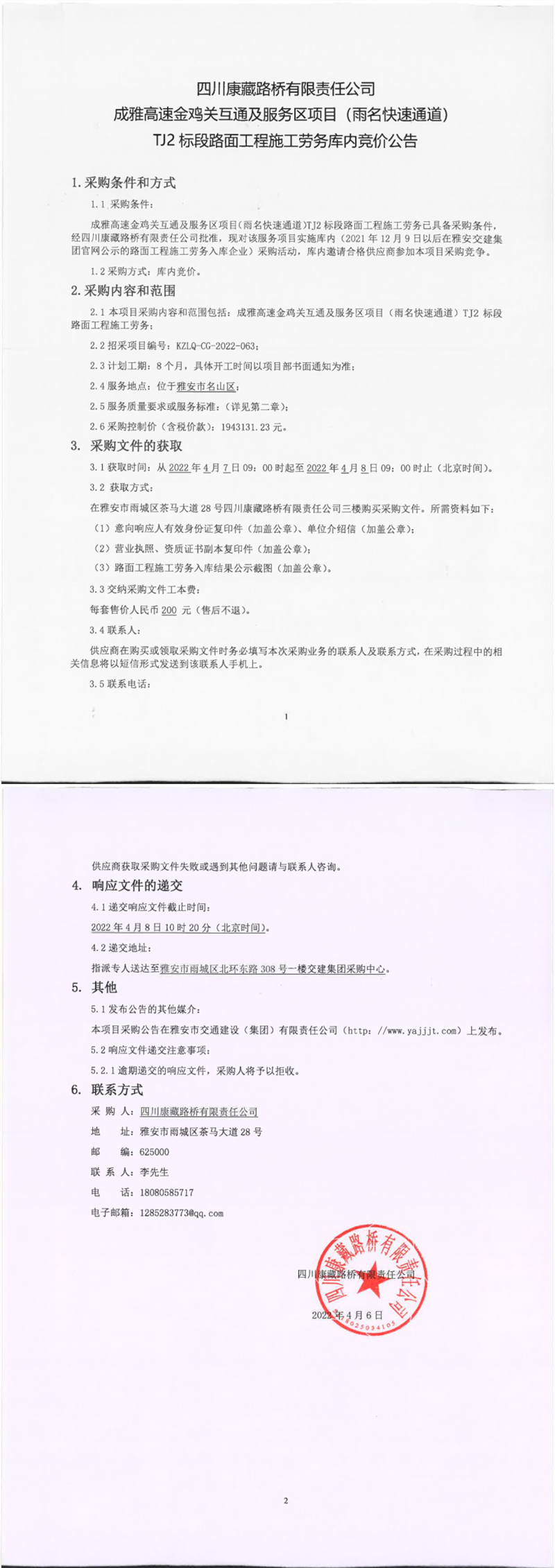 四川康藏路橋有限責(zé)任公司成雅高速金雞關(guān)互通及服務(wù)區(qū)項(xiàng)目(雨名快速通道)TJ2標(biāo)段路面工程施工勞務(wù)庫內(nèi)競價(jià)公告