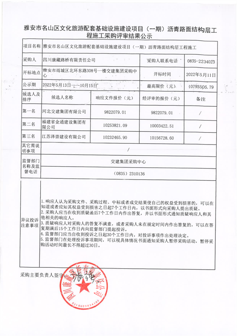 四川康藏路橋有限責(zé)任公司雅安市名山區(qū)文化旅游配套基礎(chǔ)設(shè)施建設(shè)項(xiàng)目(一期)瀝青路面結(jié)構(gòu)層工程施工采購評(píng)審結(jié)果公示