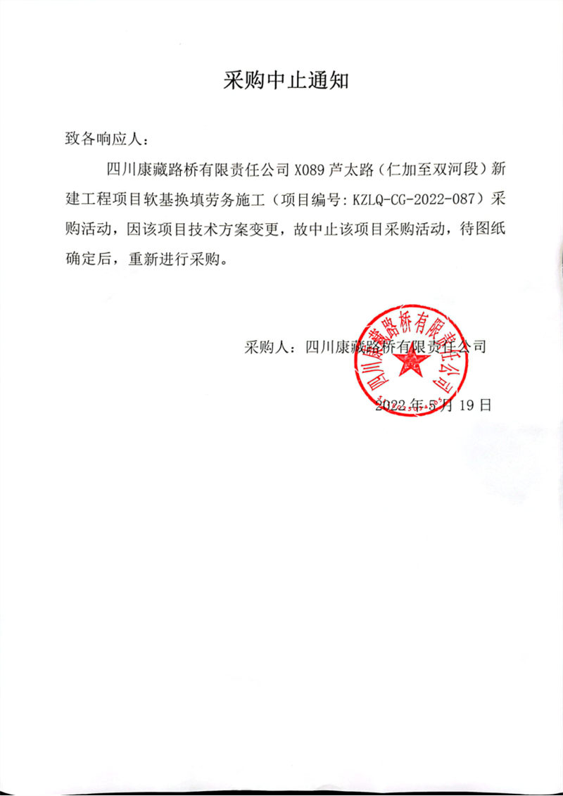 四川康藏路橋有限責任公司X089蘆太路(仁加至雙河段)新建工程項目軟基換填勞務施工采購中止通知