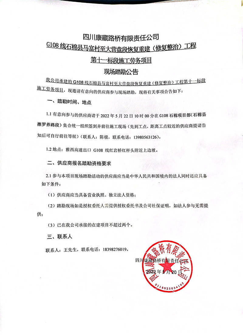 四川康藏路橋有限責(zé)任公司G108線石棉縣馬福村至大營盤段恢復(fù)重建(修復(fù)整治)工程第十一標(biāo)段施工勞務(wù)項(xiàng)目現(xiàn)場踏勘公告
