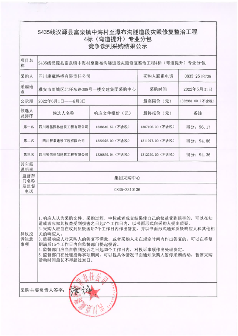 四川康藏路橋有限責任公司S435線漢源縣富泉鎮(zhèn)中海村至瀑布溝隧道段災毀修復整治工程4標(彎道提升)專業(yè)分包競爭談判采購結果公示