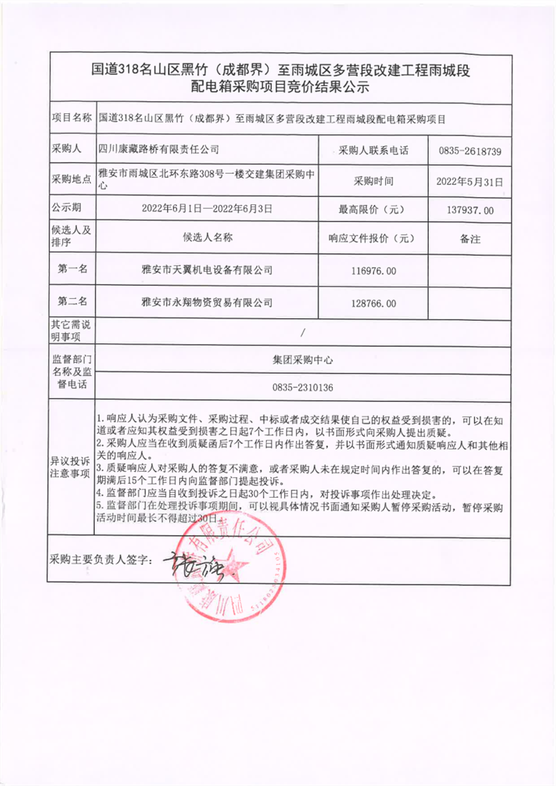 四川康藏路橋有限責(zé)任公司國(guó)道318名山區(qū)黑竹(成都界)至雨城區(qū)多營(yíng)段改建工程雨城段配電箱采購(gòu)項(xiàng)目競(jìng)價(jià)結(jié)果公示