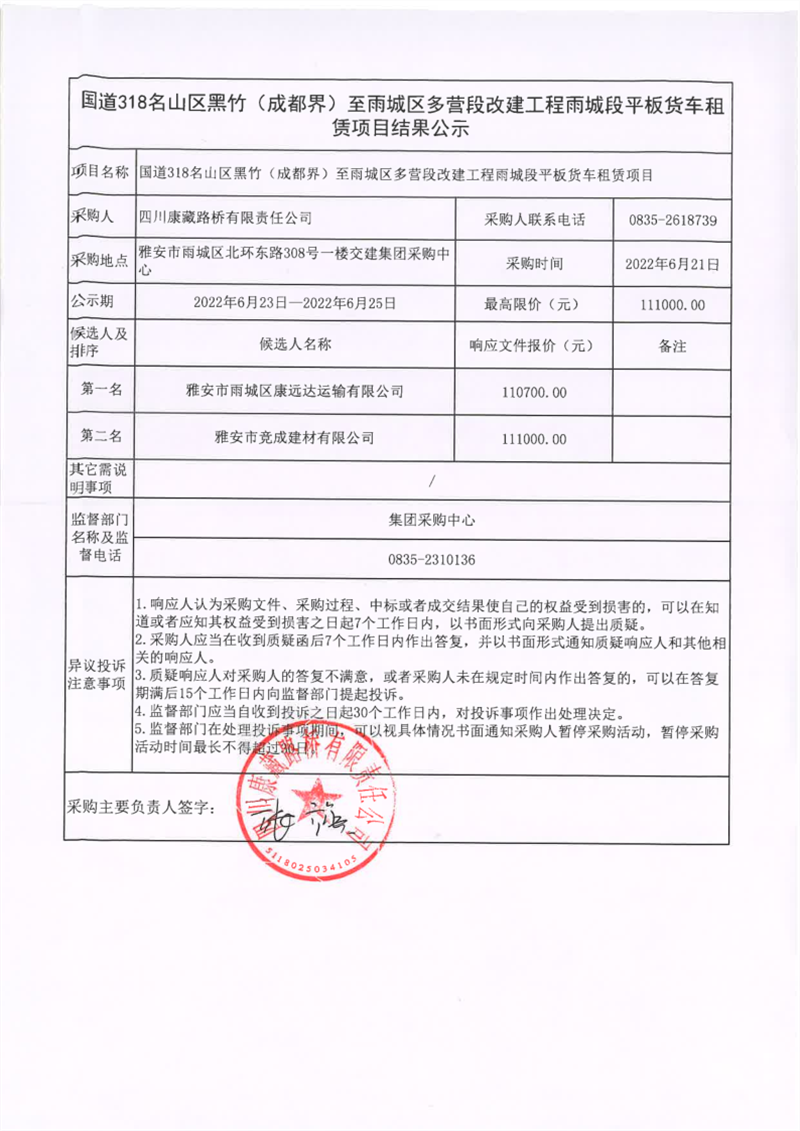 四川康藏路橋有限責(zé)任公司國(guó)道318名山區(qū)黑竹(成都界)至雨城區(qū)多營(yíng)段改建工程雨城段平板貨車(chē)租賃項(xiàng)目結(jié)果公示