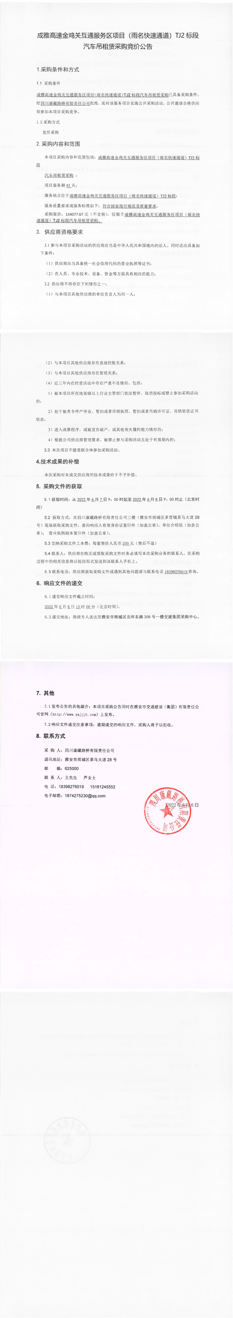 四川康藏路橋有限責任公司成雅高速金雞關互通服務區(qū)項目(雨名快速通道)TJ2標段汽車吊租賃采購競價公告