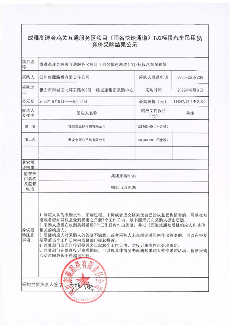 四川康藏路橋有限責任公司成雅高速金雞關(guān)互通服務區(qū)項目(雨名快速通道)TJ2標段汽車吊租賃競價采購結(jié)果公示