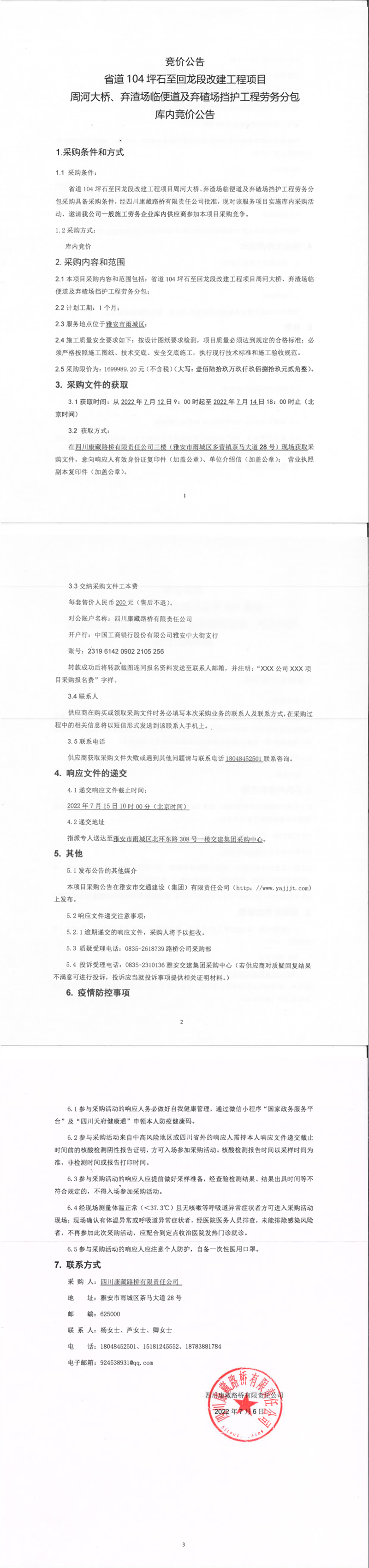 四川康藏路橋有限責任公司省道104坪石至回龍段改建工程項目周河大橋、棄渣場臨便道及棄碴場擋護工程勞務分包庫內競價公告
