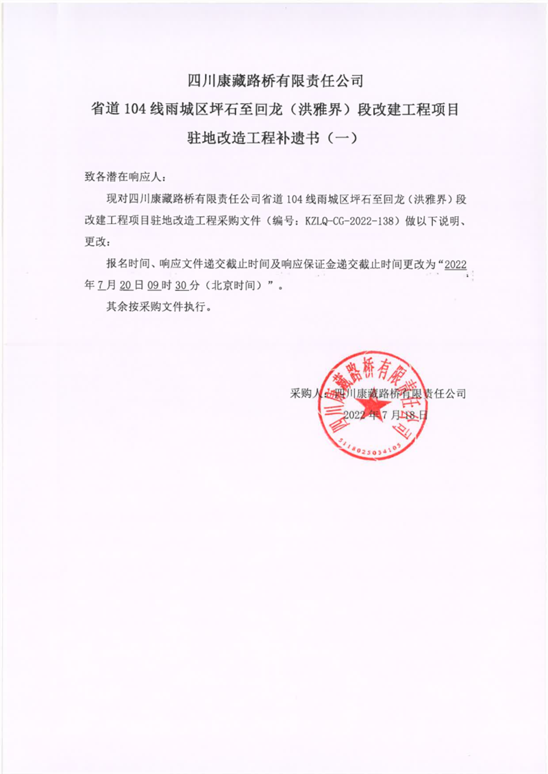 四川康藏路橋有限責(zé)任公司省道104線(xiàn)雨城區(qū)坪石至回龍(洪雅界)段改建工程項(xiàng)目駐地改造工程補(bǔ)遺書(shū)(一)