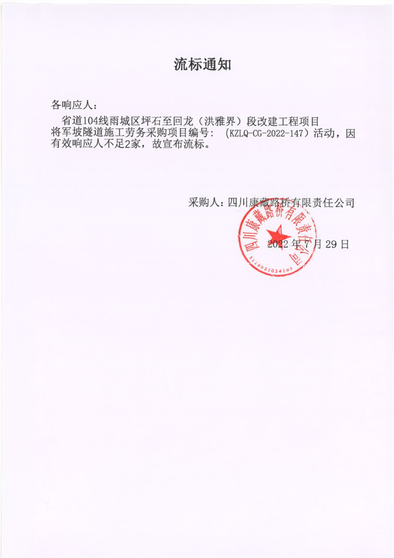 四川康藏路橋有限責(zé)任公司省道104線雨城區(qū)坪石至回龍(洪雅界)段改建工程項(xiàng)目將軍坡隧道施工勞采購(gòu)流標(biāo)通知