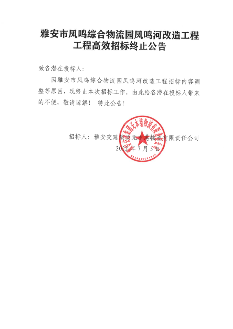 雅安交建集團(tuán)無水港物流有限責(zé)任公司雅安市鳳鳴綜合物流園鳳鳴河改造工程高效招標(biāo)終止公告