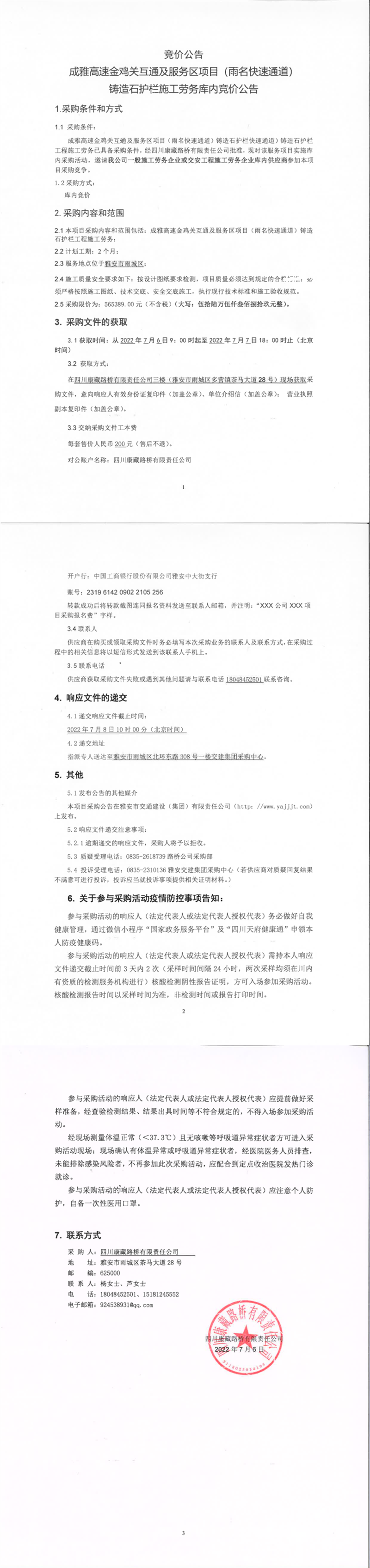 四川康藏路橋有限責(zé)任公司成雅高速金雞關(guān)互通及服務(wù)區(qū)項(xiàng)目(雨名快速通道)鑄造石護(hù)欄施工勞務(wù)庫(kù)內(nèi)競(jìng)價(jià)公告