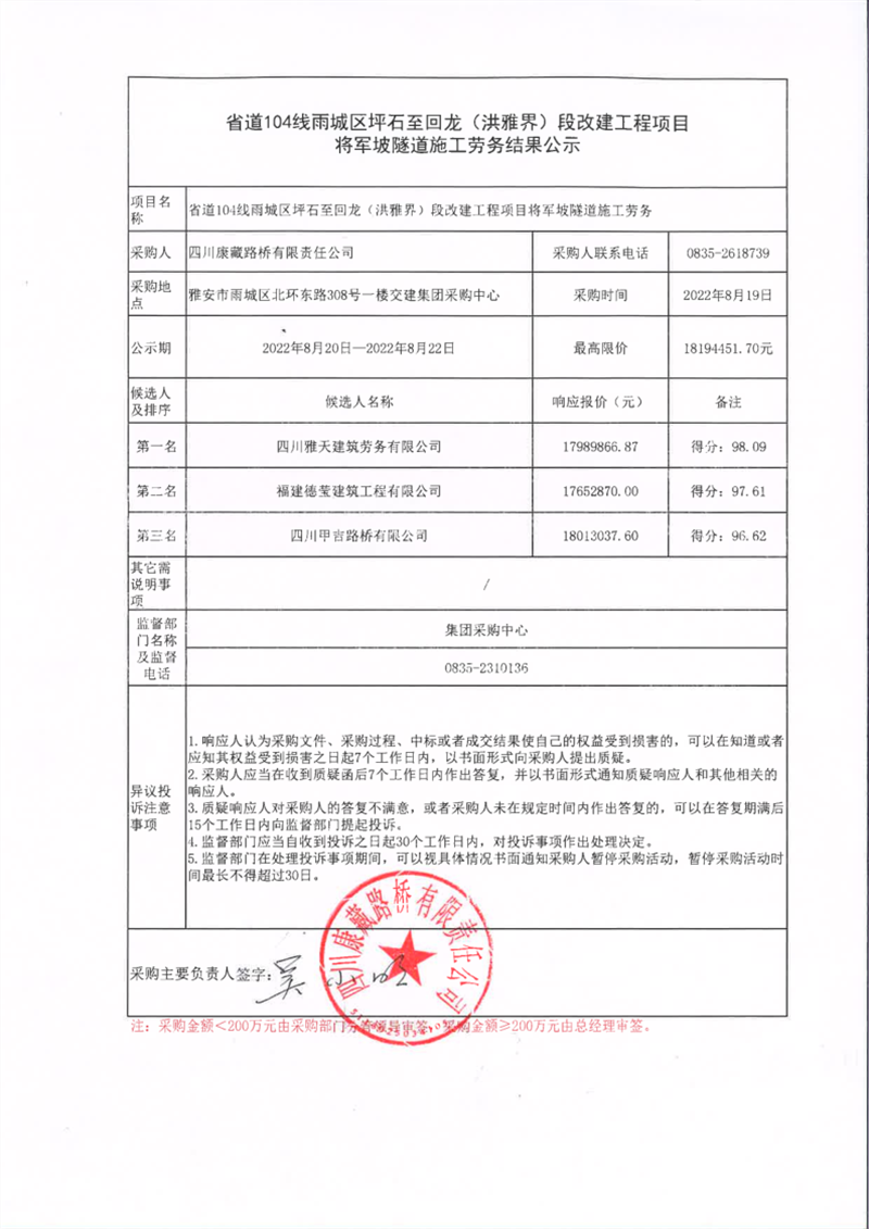 四川康藏路橋有限責(zé)任公司省道104線雨城區(qū)坪石至回龍(洪雅界)段改建工程項(xiàng)目將軍坡隧道施工勞務(wù)結(jié)果公示
