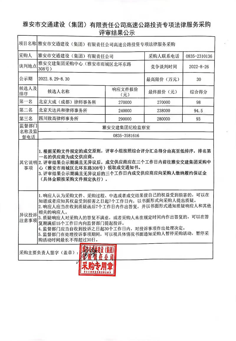 雅安市交通建設(集團)有限責任公司高速公路投資專項法律服務采購評審結果公示