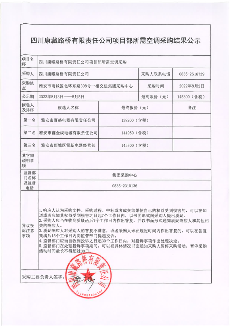 四川康藏路橋有限責任公司項目部所需空調(diào)采購結(jié)果公示