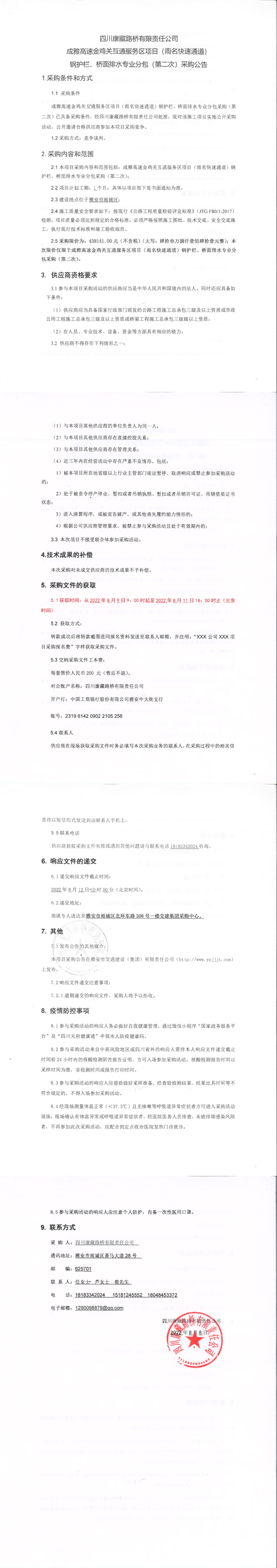 四川康藏路橋有限責任公司成雅高速金雞關(guān)互通服務(wù)區(qū)項目(雨名快速通道)鋼護欄、橋面排水工程專業(yè)分包(第二次)采購公告