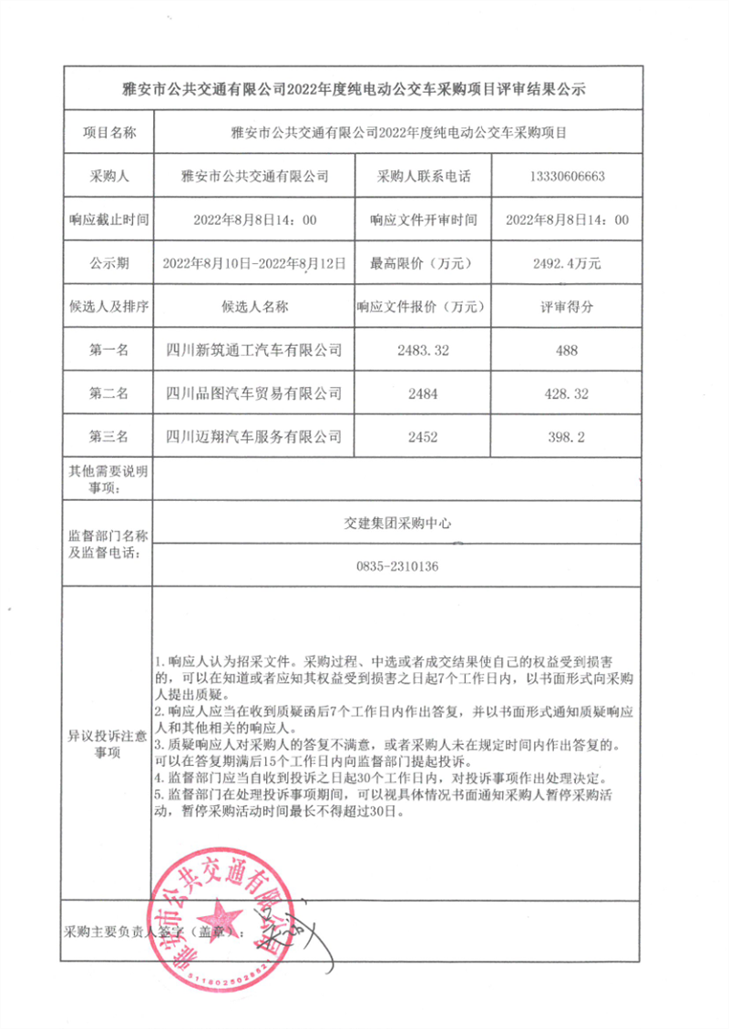 雅安市公共交通有限公司2022年度純電動(dòng)公交車采購(gòu)項(xiàng)目評(píng)審結(jié)果公示