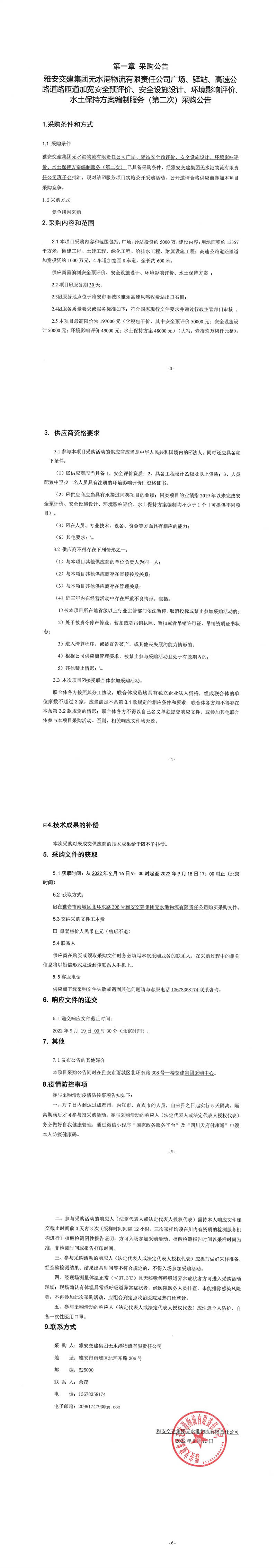 雅安交建集團(tuán)無(wú)水港物流有限責(zé)任公司廣場(chǎng)、驛站、高速公路道路匝道加寬安全預(yù)評(píng)價(jià)、安全設(shè)施設(shè)計(jì)、環(huán)境影響評(píng)價(jià)、水土保持方案編制服務(wù)(第二次)采購(gòu)公告