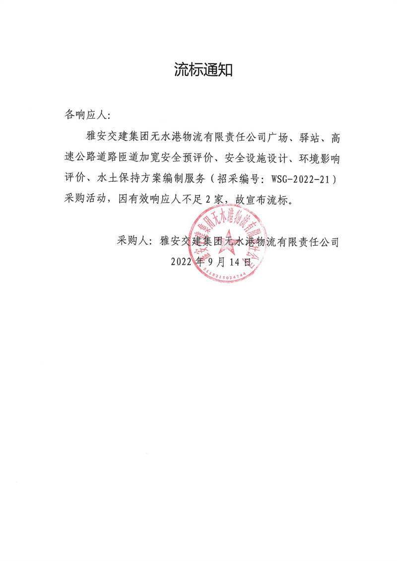 雅安交建集團(tuán)無水港物流有限責(zé)任公司廣場、驛站、高速公路道路匝道加寬安全預(yù)評價(jià)、安全設(shè)施設(shè)計(jì)、環(huán)境影響評價(jià)、水土保持方案編制服務(wù)采購流標(biāo)通知