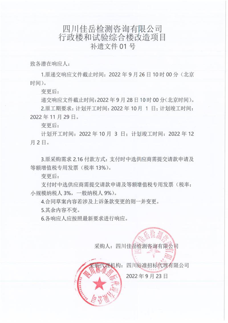 四川佳岳檢測咨詢有限公司行政樓和試驗綜合樓改造項目補(bǔ)遺文件01號