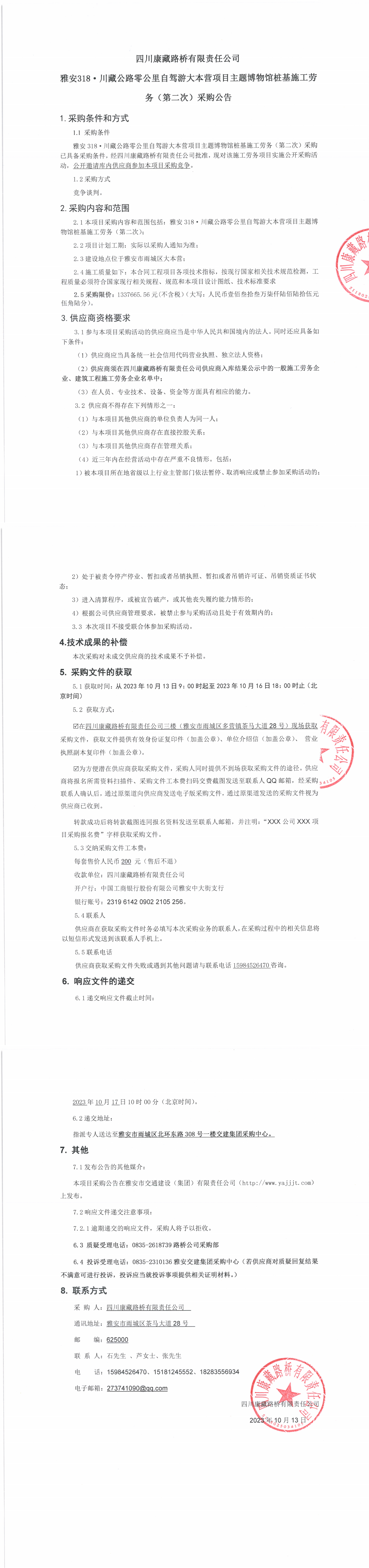 四川康藏路橋有限責(zé)任公司雅安318·川藏公路零公里自駕游大本營項(xiàng)目主題博物館樁基施工勞務(wù)(第二次)采購公告
