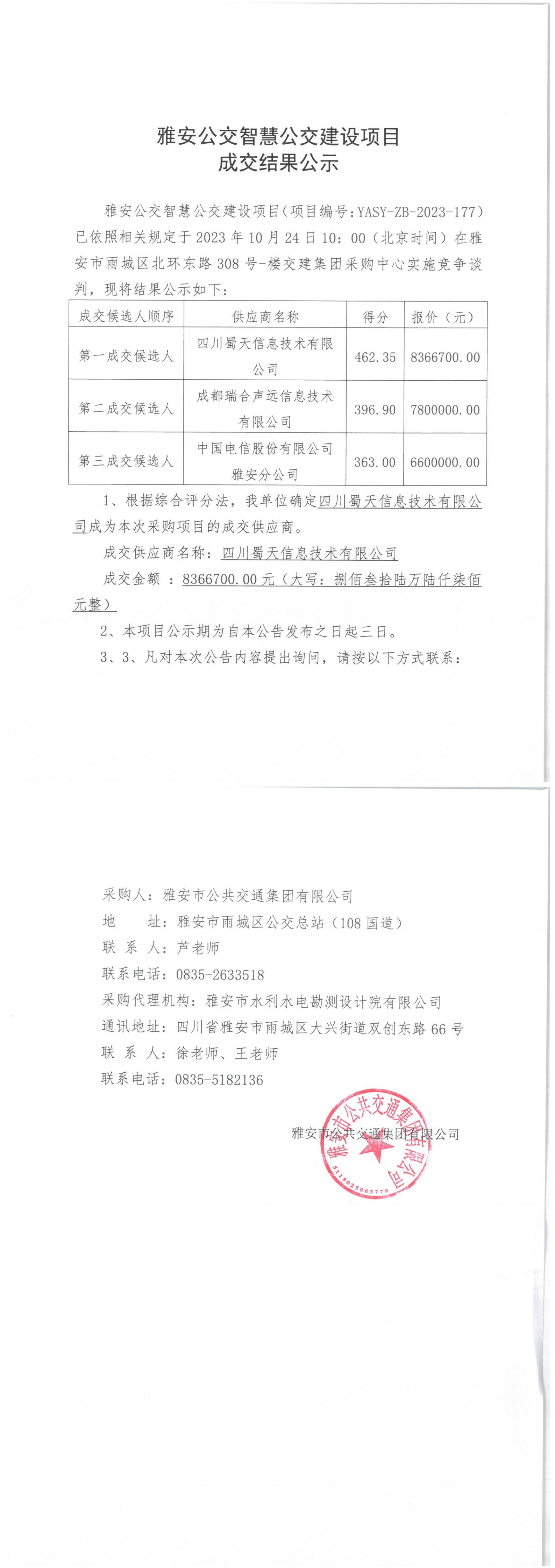 雅安市公共交通集團(tuán)有限公司雅安公交智慧公交建設(shè)項(xiàng)目成交結(jié)果公示